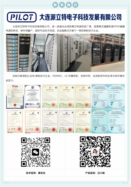 大連派立特電子科技發(fā)展有限公司,是一家面向全球的真空電源供應(yīng)廠商,是集真空鍍膜電源/PVD鍍膜電源的研發(fā)、制作到量產(chǎn),提供專業(yè)技術(shù)咨詢,及設(shè)備解決方案于一身的高新技術(shù)企業(yè)。 主要在售電源品類如下,已廣泛應(yīng)用于諸多業(yè)內(nèi)頭部企業(yè)并得到高度認可,支持按需定制: 多弧電源 燈絲電源 清洗電源 轟擊電源 靜電吸附電源 脈沖弧電源 中頻濺射電源 脈沖偏壓電源 離子源電源 直流磁控濺射電源 直流脈沖濺射電源 and so on... 目前已取得的認證有:高新技術(shù)企業(yè),ISO9001,CE,專精特新,發(fā)明專利、實用新型專利及美術(shù)、軟件著作權(quán)若干。